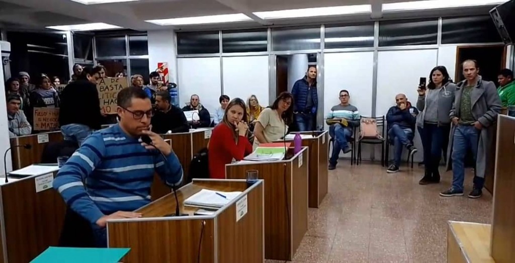 Con carteles y pancartas llegaron hasta el lugar para manifestarse desde la agrupaciones sociales y fue Fernando Cerretani quien interrumpió la sesión pidiendo que se leyera una nota y fue entonces que se produjo un cruce con el presidente del concejo deliberante Sergio Costoya quién no dio lugar al pedido de lectura por considerar que no estaba en el orden del día.