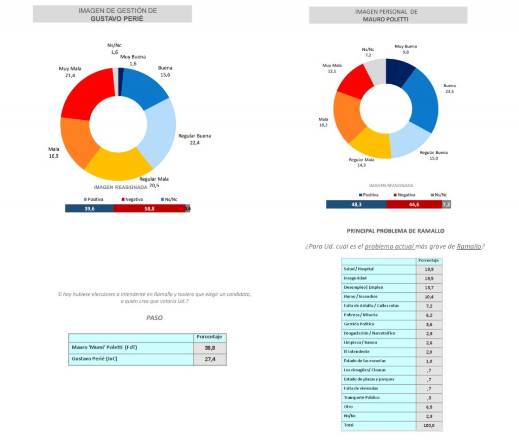 Otro dato para destacar es que casi el 50% de los ramallenses considera que la ciudad “está peor que antes”, por lo que el escenario electoral de hoy conlleva a un triunfo de Poletti con más del 38,8% de intención de voto, sobre un 27,4% del actual intendente. En el 2015 alcanzó el 44% de los votos, en el 2011 42,1% y en el 2019,  47,58 por ciento.