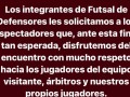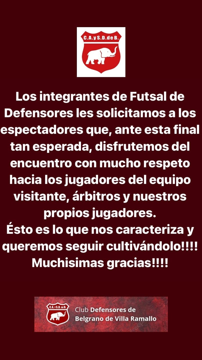 Los dirigentes del futsal granate les piden a sus simpatizantes que acompañen al equipo con buen comportamiento. La reglamentación de esta actividad con relación al comportamiento de los simpatizantes es distinta al del fútbol tradicional, si algún hincha insulta al árbitro o algún rival es automáticamente expulsado del estadio. El club Defensores pide que acompañen al equipo con aliento y sin desmanes.