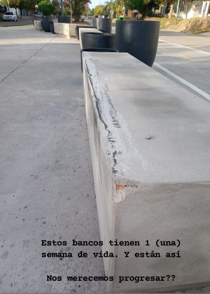 Los bancos que se construyeron están dañados. “Yo publique en mis redes, no sé si es un sentimiento de tristeza o bronca, uno quiere darle vida a nuevos espacios. Esto es vandalismo. Todos deberíamos saber lo que es el espacio público, es de todos. Uno confía que cada ciudadano va a cuidar, y la verdad es que duro poco y nada” afirmó con tono severo.