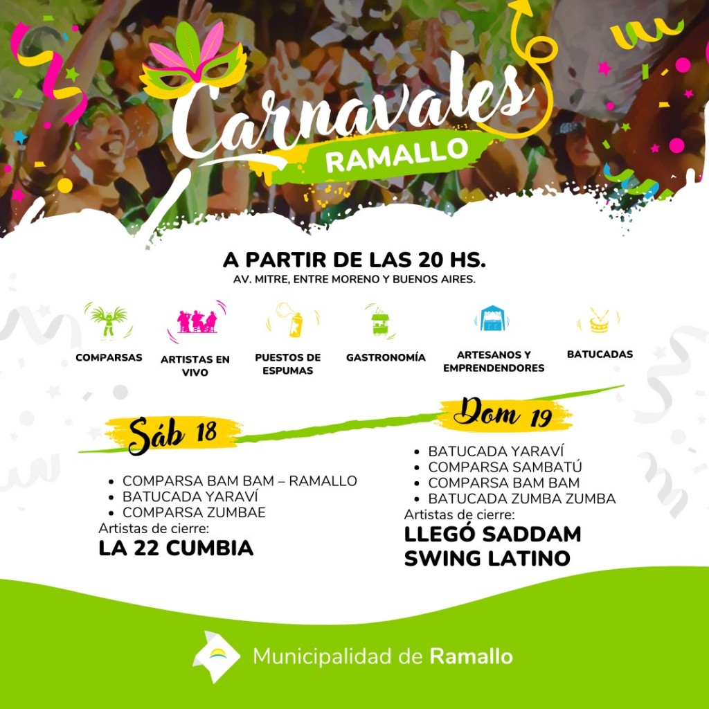 Dos noches plenas de carnaval se vivirán en la tradicional avenida Mitre de la ciudad de Ramallo. El Gobierno local informó que serán con entrada libre y gratuita. Esperan una participación masiva de vecinos. Habrá shows en vivo, batucadas y comparsas.