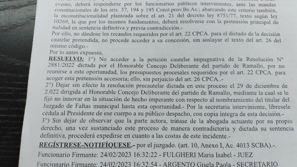 La jueza María Isabel Fulgheri, titular del juzgado contencioso administrativo resolvió: "no acceder a la petición cautelar impugnativa de la Resolución N°2881/2022 dictada por el Honorable Concejo Deliberante...".