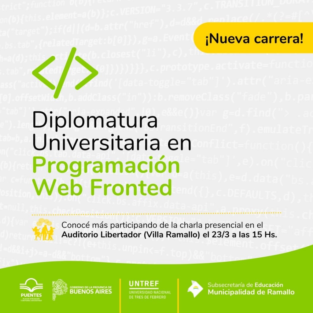 El día jueves 23 de marzo a las 15:00 hs en el Auditorio Libertador de Villa Ramallo se llevará adelante la firma del convenio entre la Municipalidad de Ramallo, autoridades del Consejo Universitario de la Provincia de Buenos Aires y la Universidad Nacional de Tres de Febrero con el fin de anunciar la Diplomatura Universitaria en Programación Web Fronted.