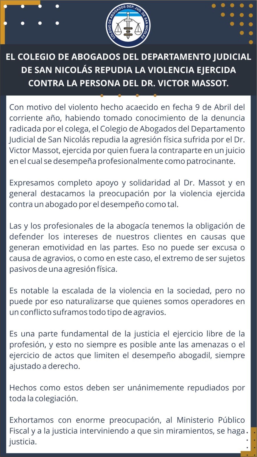 El Colegio de abogados del departamento judicial San Nicolás repudió la agresión al Dr. Massot