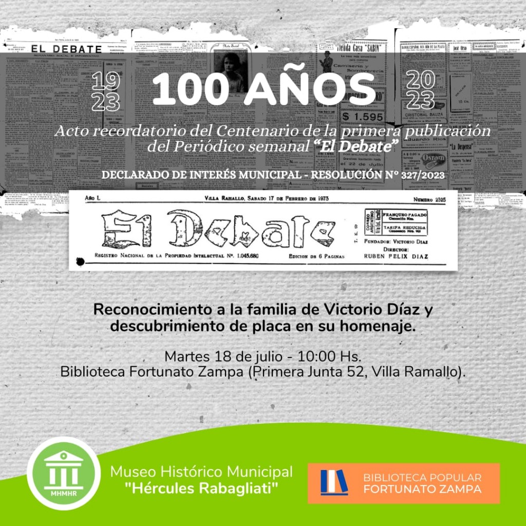 La Biblioteca Popular Fortunato Zampa de Villa Ramallo (Primera Junta 52) se vestirá de emoción y reconocimiento este martes 18 de julio a las 10 hs, en un acto especial dedicado a la familia de Victorio Díaz, fundadores del emblemático diario El Debate. La ocasión marcará el centenario del periódico, que se cumpliría este año, y será una oportunidad para rememorar su valiosa contribución al periodismo local.