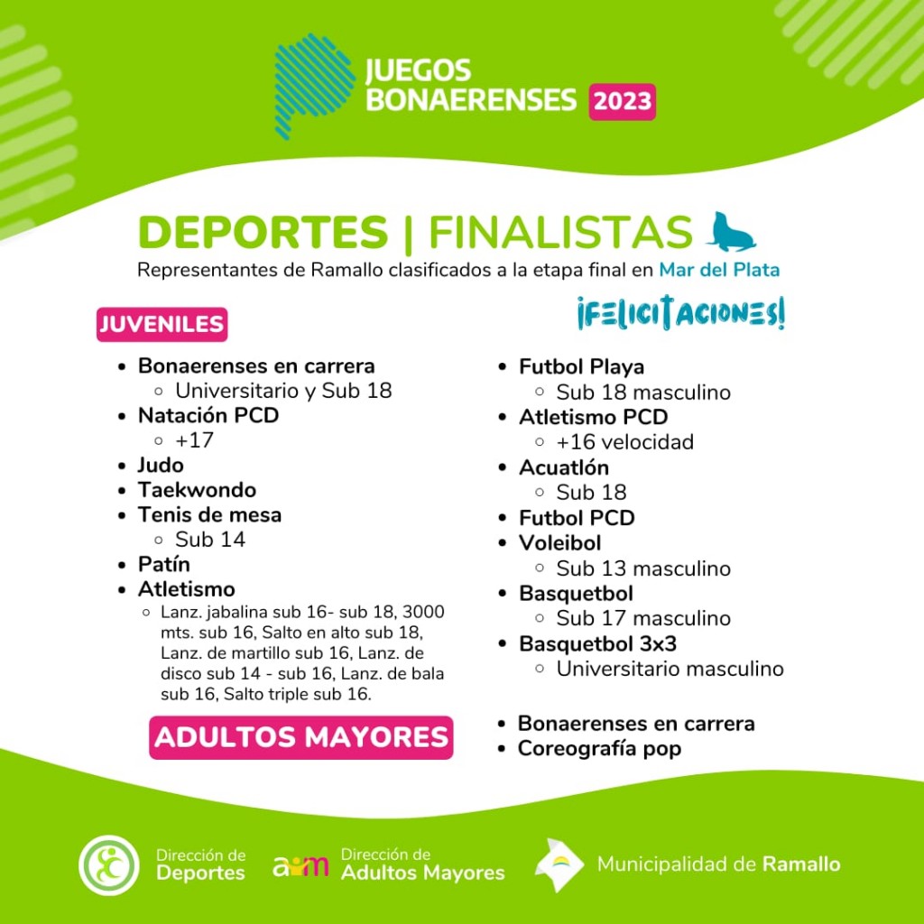 Del 15 al 20 de septiembre se va a desarrollar en Mar del Plata, la Final Provincial de los Juegos Bonaerenses. Ramallo clasificó en las siguientes disciplinas: Bonaerenses en carrera- Natación PCD- Judo- Taekwondo- Tenis de mesa- Patín- Atletismo- Futbol Playa- Atletismo PCD- Acuatlón- Futbol PCD- Voleibol- Basquetbol- Basquetbol 3x3. La delegación ramallense entre deportistas, profesores y delegados será de alrededor de 135 personas.