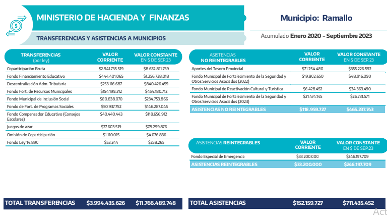 El concejal Hernán Stebano,  compartió a través de sus redes sociales un desglose pormenorizado de los fondos asignados por la provincia de Buenos Aires al partido desde enero 2020 a septiembre 2023