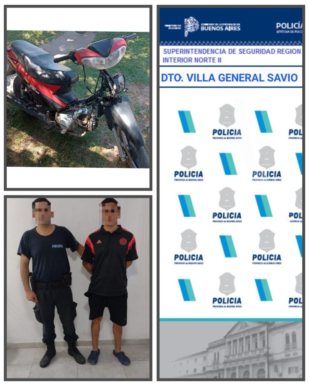 En respuesta a un llamado a la dependencia, efectivos del Destacamento de Villa Gral Savio lograron la aprehensión de un individuo mayor de edad que había sustraído una motocicleta Zanella ZB 110cc del estacionamiento de una chatarrería en Calle Tierra del Fuego.