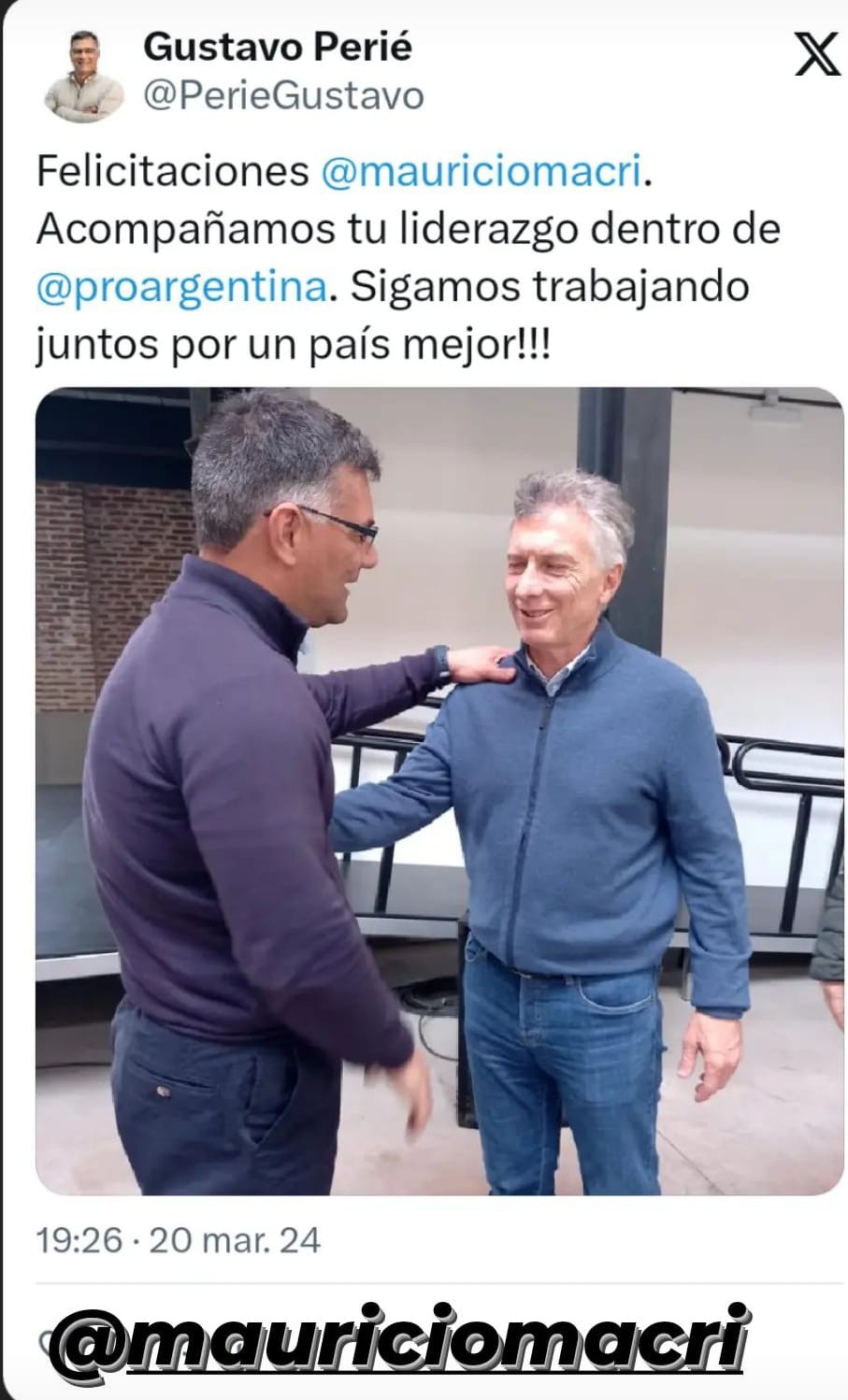 En su cuenta de X (ex Twitter), Perie manifestó: "Felicitaciones @mauriciomacri. Acompañamos tu liderazgo dentro de @proargentina. Sigamos trabajando juntos por un país mejor!!!".