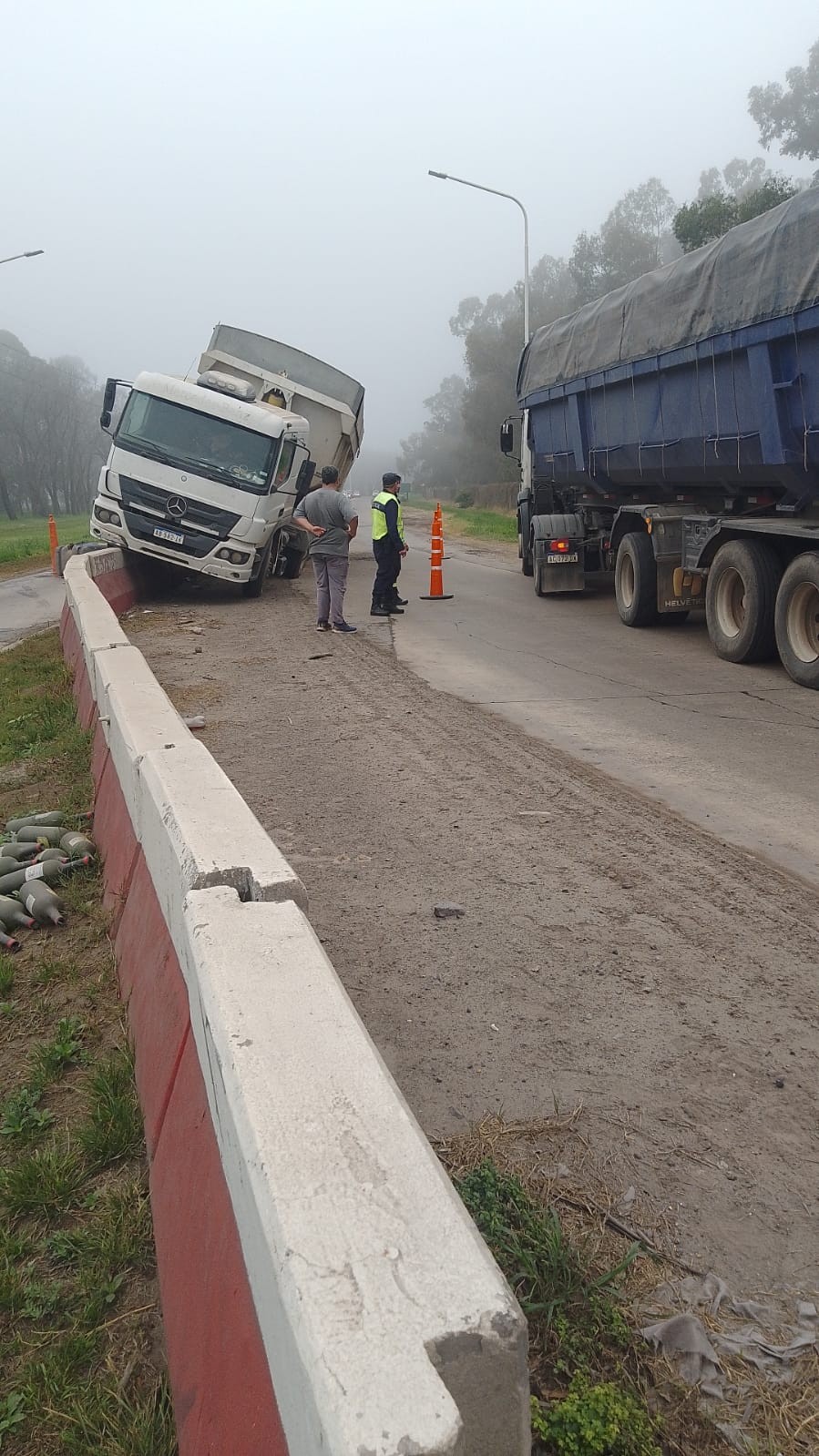 Un camión Mercedes Benz ATEGO 1726 conducido por un hombre de 39 años de Chañar Ladeado, Santa Fe, se subió al guarda raíl en Av. Industria Nacional.
