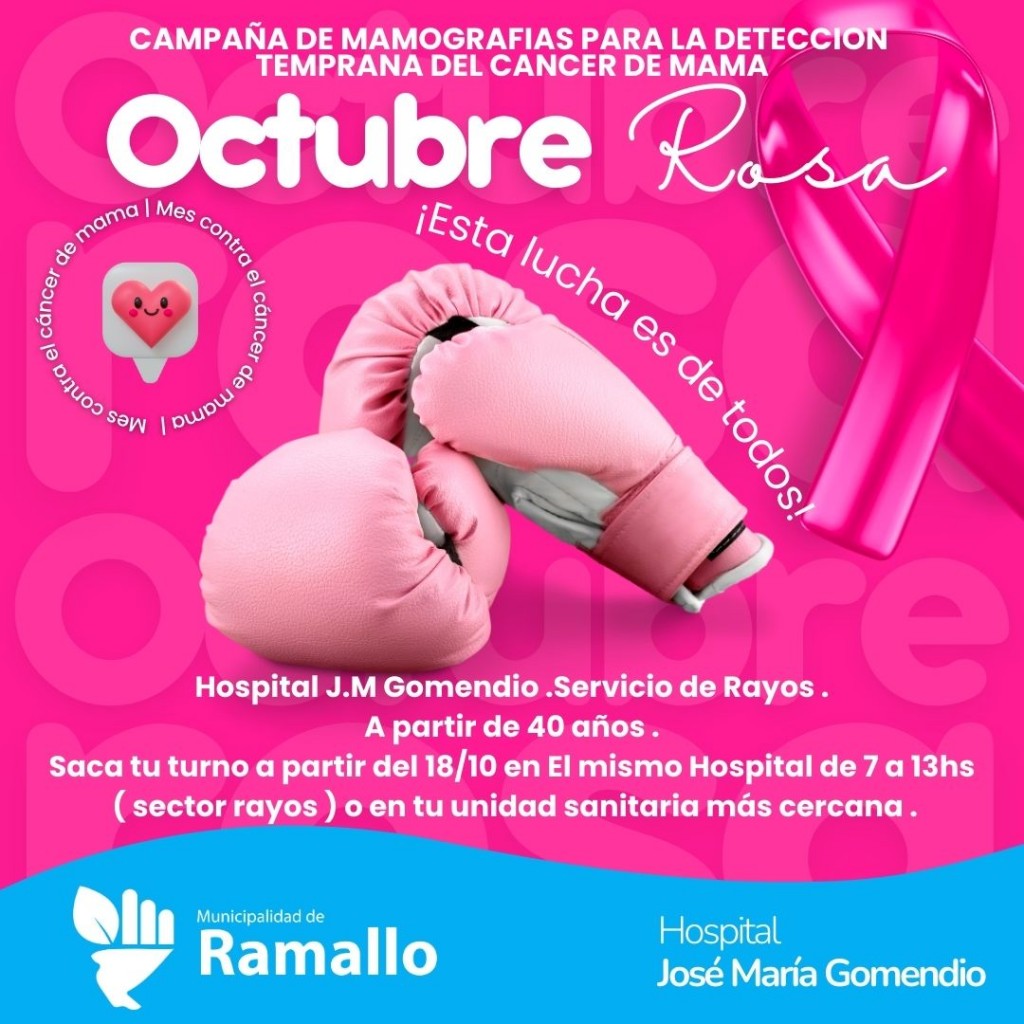 A partir del viernes 18 de octubre, el Hospital José María Gomendio y las Unidades Sanitarias del partido de Ramallo iniciarán la campaña "Octubre Rosa" para la detección temprana del cáncer de mama. Durante 15 días, se realizarán mamografías gratuitas sin orden médica para mujeres mayores de 40 años. Además, el sábado 19 se llevarán a cabo actividades recreativas y una caminata en el Paseo Leandro Mansilla para concientizar sobre la enfermedad.