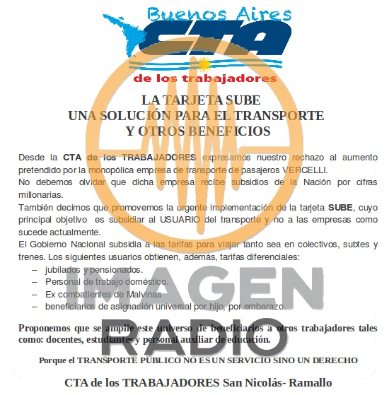 También decimos que promovemos la urgente implementación de la tarjeta SUBE, cuyo principal objetivo es subsidiar al USUARIO del transporte y no a las empresas como sucede actualmente.