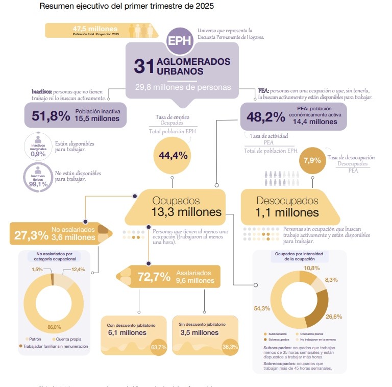El empleo asalariado sigue siendo el más común, pero con una alarmante informalidad: el 36,3% de los asalariados no tiene descuento jubilatorio, lo que evidencia el crecimiento del empleo precario.