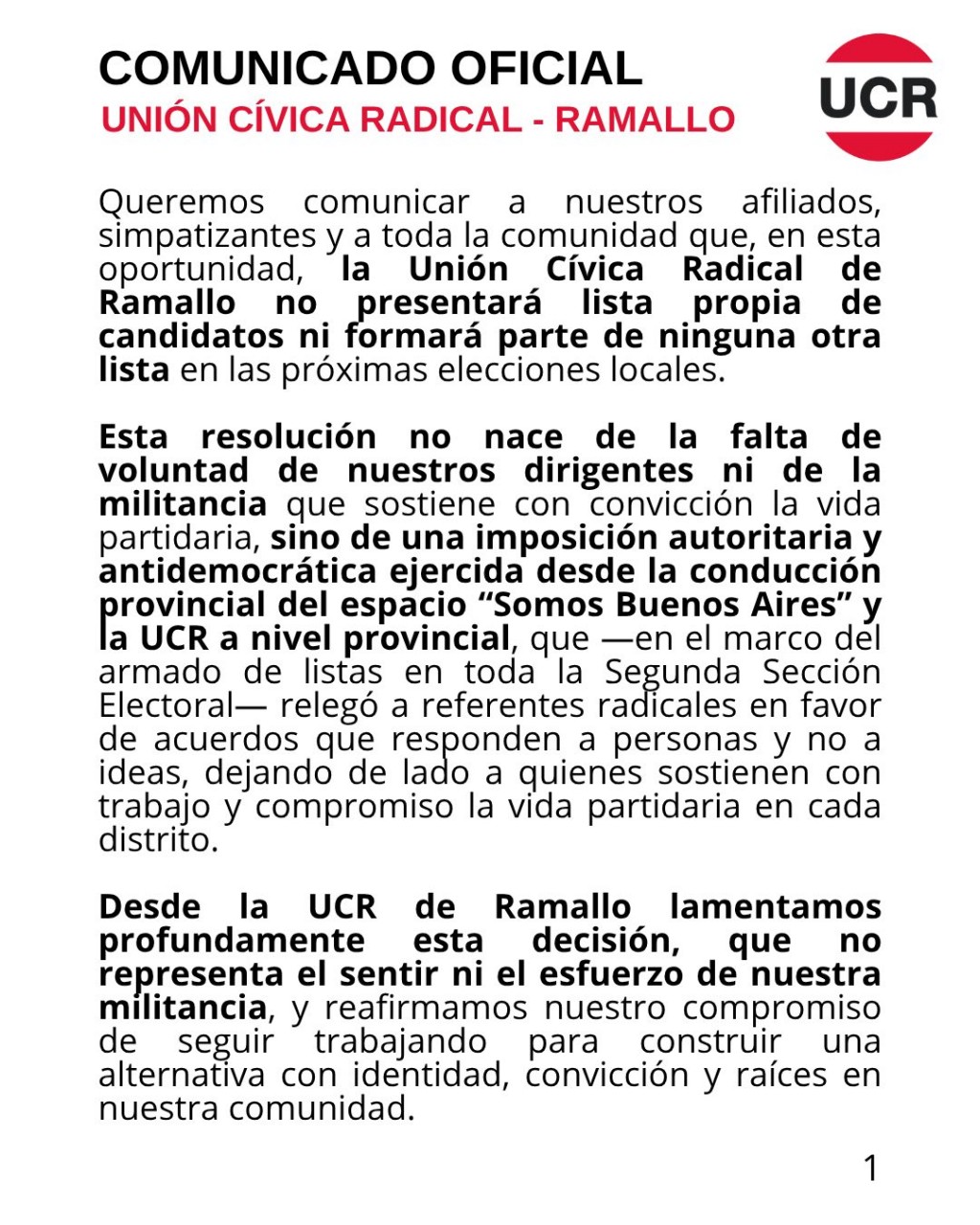 La Unión Cívica Radical (UCR) de Ramallo anunció oficialmente que no participará con lista propia ni integrará ningún frente electoral en las próximas elecciones locales.