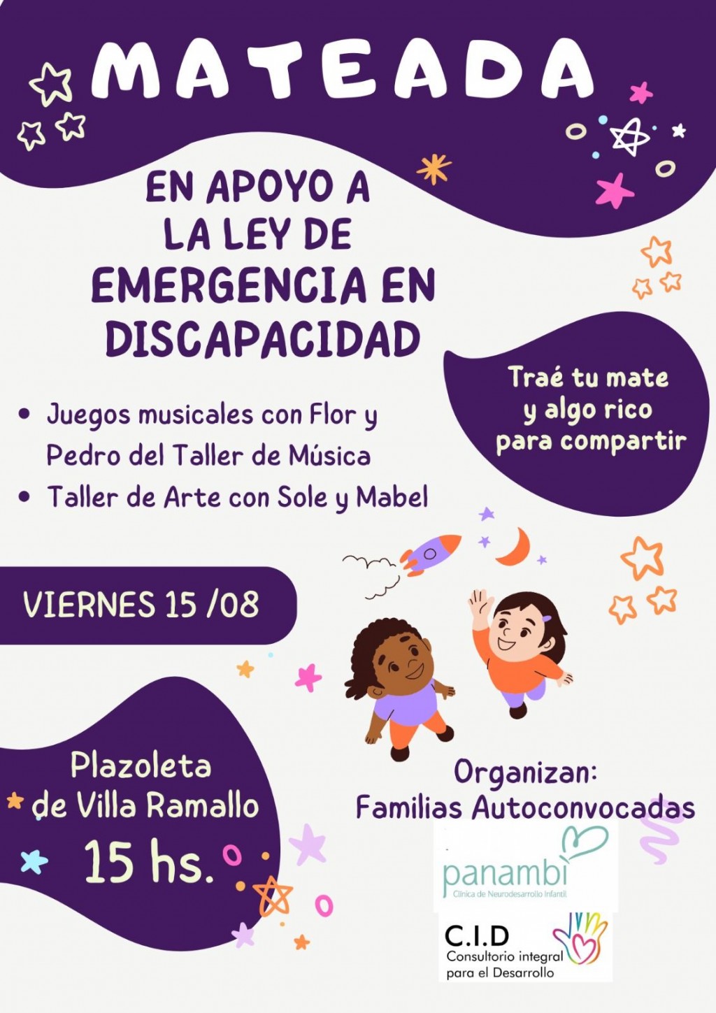 Este viernes 15 de agosto, la plazoleta de Villa Ramallo se llenará de música, colores y mateadas en apoyo a la Ley de Emergencia en Discapacidad. La iniciativa, organizada por familias autoconvocadas junto a las instituciones Panambí y C.I.D. (Consultorio Integral para el Desarrollo), busca generar un espacio de encuentro, concientización y diversión para toda la comunidad.