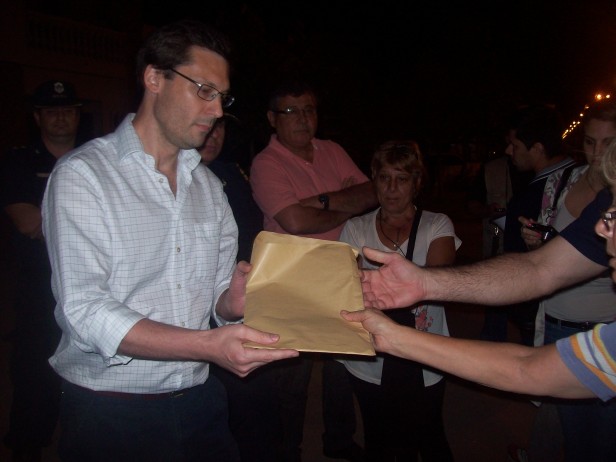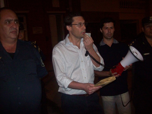 Enfrente de la Municipalidad esperaban el Secretario de Gobierno, Dr. Alejo Giovanelli, El Presidente del Concejo Deliberante, Alejandro Agotegaray, el Jefe Distrital, Comisario Gustavo Lavagnino y los Comisarios Fabio Ochaizpuro (Comisaría 1ª) y Diego Martínez (Comisaría 2ª), entre los vecinos presentes pudimos observar la presencia de los concejales Sergio Heredia y Cristian Mansilla. La Señora Yolanda Zapata, que marchaba junto a su hijo, una de las víctimas de los robos en cadena del pasado fin de semana se dirigió a los presentes al llegar frente a la municipalidad diciendo: “El delito ha avanzado demasiado en Ramallo, es hora de que Ramallo despierte, todos tenemos que despertar. El fin de esta marcha es entregar un petitorio a las autoridades  y que nos den una respuesta del resultado de la entrevista que hoy tenían con el Fiscal de la UFI Nº 6, vamos a entregar el petitorio, vamos a escuchar la respuesta y vamos a pedir que nos digan que tienen previsto hacer de ahora en más, que decisiones van a tomar para devolvernos nuestros derechos. Ellos son los que tienen que tomar decisiones y son los mediadores del pueblo, que los eligió, ante las autoridades judiciales, nosotros como pueblo solo nos queda esto, marchar, reclamar, pedir que nos escuchen, nunca hubiéramos querido llegar a esto, pero no nos queda otra alternativa. En esta oportunidad me robaron a mí, a mis vecinos, a varios vecinos, mañana pueden ser otros, tal vez aquel que nunca le paso, diga, a mi no me va a pasar, yo también alguna vez lo dije, pero me paso, entonces lo que pedimos es serenidad, escuchar a las autoridades, que nos den una respuesta, entregar el petitorio y como vinimos, en paz, en orden, volvernos a nuestras casas, no hay otro propósito en esta marcha, somos el pueblo de Ramallo, o una parte del pueblo que está en representación de todos los vecinos, que deberían estar acá”. Luego agregó, “Seamos solidarios, vigilantes de nuestra seguridad, observemos lo que pasa adelante, al costado, tengamos cuidado, pongamos trancas, rejas, cuando llegamos en los autos miremos, no dejemos nada de valor afuera de nuestras casas, porque todo eso es los que ellos buscan, elementos que después puedan vender, por eso, cuando les ofrecen herramientas baratas, no las compren, son robadas. Lo único que nos puede salvar es ser buen vecino, a pesar de los que hemos crecido, Ramallo sigue siendo una ciudad chica, ayudémonos entre todo. No miremos para otro lado por favor, seamos solidarios, ayudémonos, seamos policías, pero sin violencia, con colaboración, llamando por teléfono a la policía, llamando al vecino, esto no es nada agradable, convocar la marcha, estar acá, caminar pidiendo seguridad, tenemos que volver a caminar tranquilos por la plaza, andar en bicicleta, poder enviar los chicos a hacer los mandados, algo que ya no podemos hacer, despertemos, tratemos de recuperar la tranquilidad, por favor”. Dicho esto, algunas personas firmaron el petitorio que ya tenía varias firmas y previa lectura del contenido, procedieron a entregar el mismo al Secretario de Gobierno, algunos vecinos preguntaron por el Intendente a lo que el Dr. Giovanelli respondió que se encontraba en Buenos Aires. Después llegaron las explicaciones, en medio de gente un poco cansada, alterada, por lo que consideran falta de respuesta y promesas incumplidas, el Dr. Giovanelli señalo: “Como habíamos hablado con algunos vecinos a la mañana, con el Jefe Distrital, fuimos a la fiscalía Nº 6, donde nos entrevistamos con el Fiscal Giannorio, la idea era tener una letra segura de lo que había ocurrido, porque por ahí trascienden un montón de noticias y uno no tiene cual es la verdadera causa por lo cual se liberó al delincuente. El Fiscal nos decía que se ha atenido a la letra de la ley, que todos estos procesos se encausan con la libertad de los procesados y más allá de que el acusado vaya a juicio público a la brevedad, son procesos que legalmente está establecido que se sigan en libertad del imputado, la inquietud que tiene ustedes, es la que tenemos nosotros, y agradecemos esta convocatoria, porque a nosotros nos permite también elevar nuestra voz, pidiendo no ya seguridad, si no punidad, porque acá lo que se vive no es tanto inseguridad, si no impunidad, por lo cual se está reclamando. La idea es hacer un seguimiento de todas las causas, de tal manera de estar encima de cada una de ellas, tratar de que el fiscal compendie en una sola causa, todas las acusas, de manera que se pueda obtener un sentencia justa, una condena real y efectiva que es lo que todo el mundo está esperando”. Esto provocó la reacción de algunos de los presentes que señalaban, “Mientras tanto que, acá no hay un solo delincuente y no se hace nada con ninguno”, otro señalaba “Mientras estamos acá, seguramente están robando alguna de nuestras casas”, otro vecino señaló  “Esto es más de lo mismo, no tenemos nada como respuesta, se están investigando los robos cometidos por este chico? Ustedes deben saber que hay alguien más detrás de estos robos, no pensaran que una sola persona roba herramientas, televisores, equipos de música, en una sola noche solo, está claro que hay más metidos en esto, eso se investiga? alguien está haciendo algo? . Otro vecino señaló: “Acá va a haber un muerto, y quién se lo va a cargar?,  Voz? señalando al Secretario de Gobierno, porque va  a aparecer un loquito afectado y va a terminar haciendo un desastre, tiene que hacer algo para encerrarlo, hacer algo para rehabilitarlo a ese pibe, tienen que hacer algo para rehabilitarlo, para ayudarlo, el gobierno puede hacerlo, pero no dejarlo en la casa, porque si no estamos siempre en la misma, el pibe se droga y sale a robar o roba para drogarse, porque está enfermo”. Giovanelli respondió que fue eso lo que se le dijo al fiscal, iba a ser lo último que iba a responder, después la noche se llenó de reclamos, algunos 
