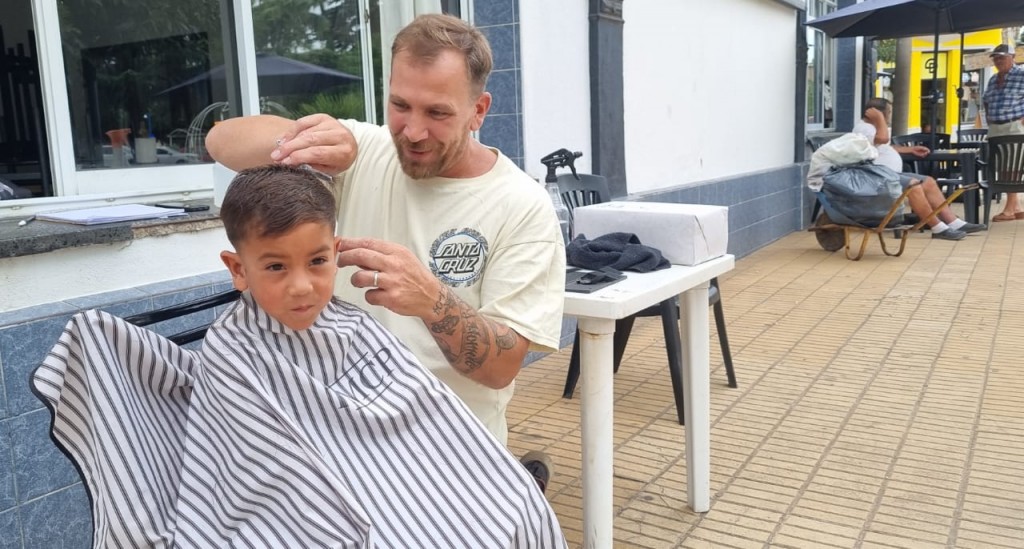 Tal como lo había anunciado en sus redes sociales, Aranguren comenzó a cortar el pelo desde las ocho de la mañana, y la respuesta fue inmediata. “Vine a las ocho y ya tenía gente esperando, no me imaginé que iba a arrancar así. Recién ahora tengo un respiro para cambiarle el agua al mate”, contó entre risas, mientras seguían llegando clientes improvisados.