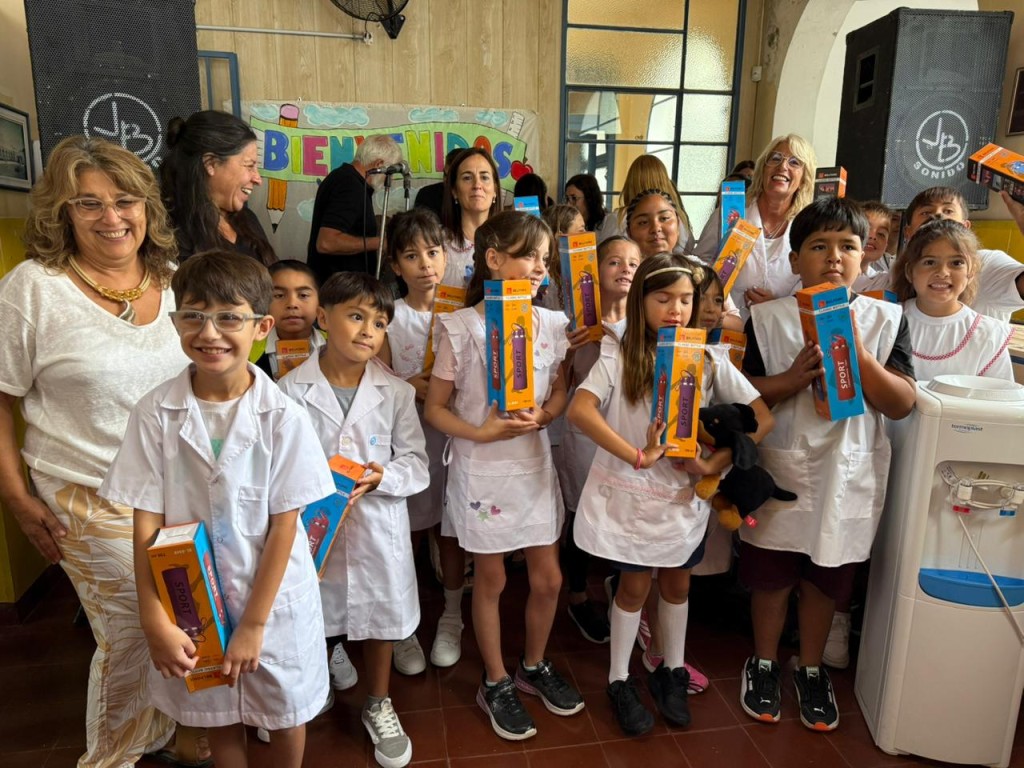 Además, se anunció la entrega de una motoguadaña a cada institución y cooperadora, con el objetivo de facilitar el mantenimiento de los predios escolares y acompañar el trabajo comunitario. En el cierre del acto, el intendente distribuyó botellas térmicas entre alumnos y docentes, promoviendo el acceso permanente a agua segura y el cuidado del ambiente.