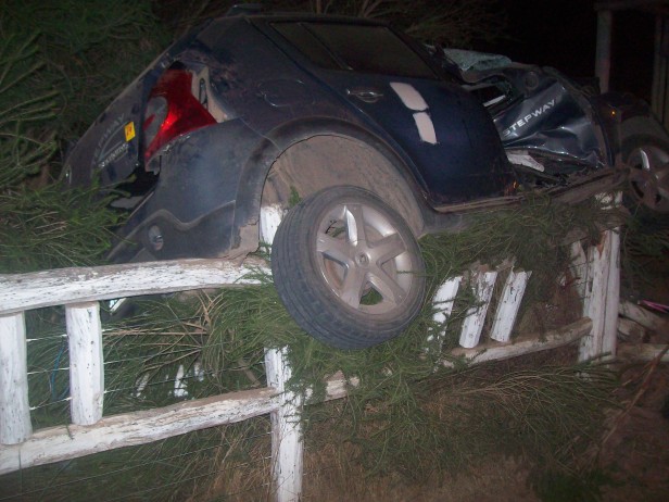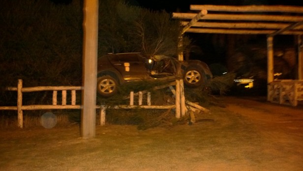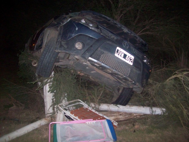 El mismo, de manera difícil de explicar, quedó sobre el cerco perimetral de la Posada El Destino, mirando hacía el restaurant Lo de Cacho. Por cuestiones milagrosas, el joven recibió, en principio heridas leves, sin dudas la fortuna estuvo del lado del adolescente, ya que nadie salía, se estaba por producir el cambio de turno, del parador en el momento del accidente. Más temprano, alrededor de las 20 horas, un Peugeot 206 conducido por una menor de 15 años, también a alta velocidad,  del lado opuesto al último accidente, rompió el cerco de madera, pasó por debajo de unos árboles y se metió dentro de la Posada El Destino. El propietario de uno de los paradores costeros, le señalo a La Radio Ramallo: “Esto es tierra de nadie, las picadas se repiten todas las noches, acá no hubo más accidentes de milagro”. Al cierre de este informe, los bomberos trabajaban en el lugar, ya que el vehículo había quedado con una pérdida de gas. Foto: (Gentileza Jonathan Bianchi).