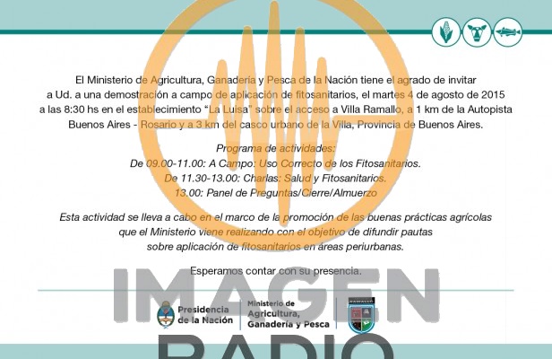 El Ministerio de Agricultura, Ganadería y Pesca de la Nación y el municipio de Ramallo invitan a la comunidad a la jornada que se realizará el próximo 4 de agosto en el establecimiento "La Luisa" sobre uso y aplicación de fitosanitarios.