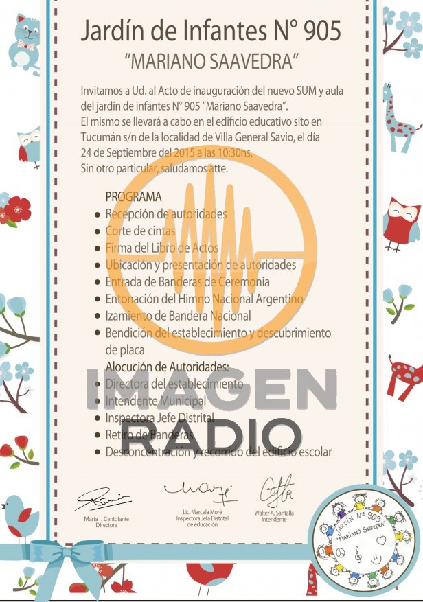 Desde Jefatura Distrital de Educación informaron e invitaron a la comunidad a participar de la inauguración de la Obra de Ampliación del Jardín Nro. 905 "Mariano Saavedra" de Villa General Savio.