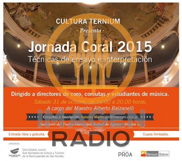Dirigido a directores de coro, coreutas y estudiantes de música tendrá lugar la Jornada Coral 2015 el sábado 31 de octubre de 16 a 20 horas en el Auditorio del Teatro Municipal DE San Nicolás con entrada libre y gratuita, a cargo del Maestro Alberto Balzanelli.