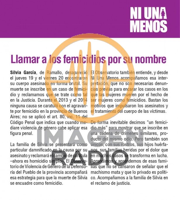 El Observatorio de Violencia de Género dependiente de la Defensoría del Pueblo de la Provincia de Buenos Aires difundió un comunicado en el que pide que el caso de Silvia García, sea caratulado como femicidio.