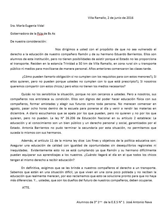 Nos dirigimos a usted con el propósito de que no sea vulnerado el derecho a la educación de nuestro compañero Ramón y de su hermano Eduardo Barrientos. Ellos son alumnos de esta institución, pero no tienen posibilidades de asistir porque el Estado no les proporciona el transporte. Residen en la estancia Trinidad a 50 km de Villa Ramallo, en zona rural sin un transporte público ni medios para movilizarse de manera personal. Años anteriores comenzaron las clases tarde.