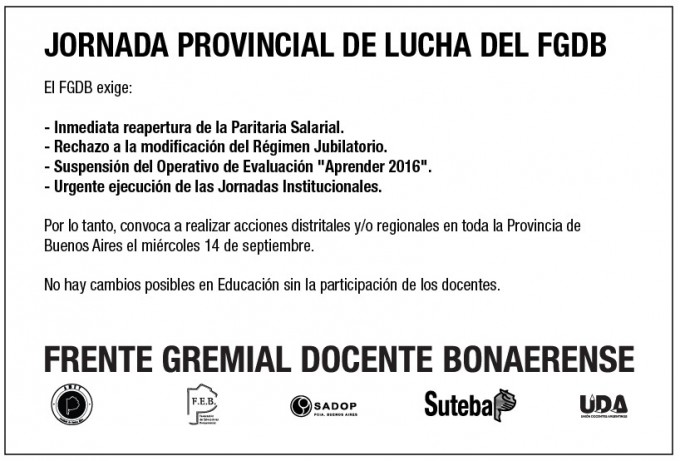 El Frente gremial docente informó que este miércoles realizarán acciones distritales ante una serie de reclamos que vienen peticionando.