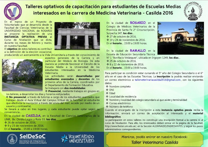 La facultad de Ciencias Veterinarias informa sobre “Talleres optativos de capacitación para estudiantes de escuelas medias interesados en la carrera de Medicina Veterinaria - Casilda 2016”, destinados a los estudiantes de 5° año de Colegios Secundarios o de 6° año en el caso de las Escuelas Técnicas, que presenten vocación por esta carrera y estén pensando en inscribirse el próximo año en esta unidad académica.