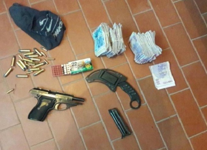 Inspeccionado el interior del vehículo incautaron una pistola calibre 22 marca Bersa, con cargador colocado con 10 proyectiles intactos. También una riñonera conteniendo 14 cartuchos intactos calibre 38 punta de plomo, una caja de proyectiles intactos calibre 22 marca Orbea (conteniendo 8 punta encamisa huecas marca OA) y trece punta de plomo marca FM. A su vez, dinero en efectivo por un total de 56.450 pesos en billetes de 50 y 100 pesos, como así también el secuestro de cinco teléfonos celulares, entre otros objetos vinculados a la comunicación.