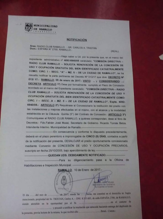 En el transcurso de la semana, mediante una notificación, el Municipio de Ramallo pidió formalmente el desalojo del predio donde actualmente funciona el Radio Club Ramallo.
