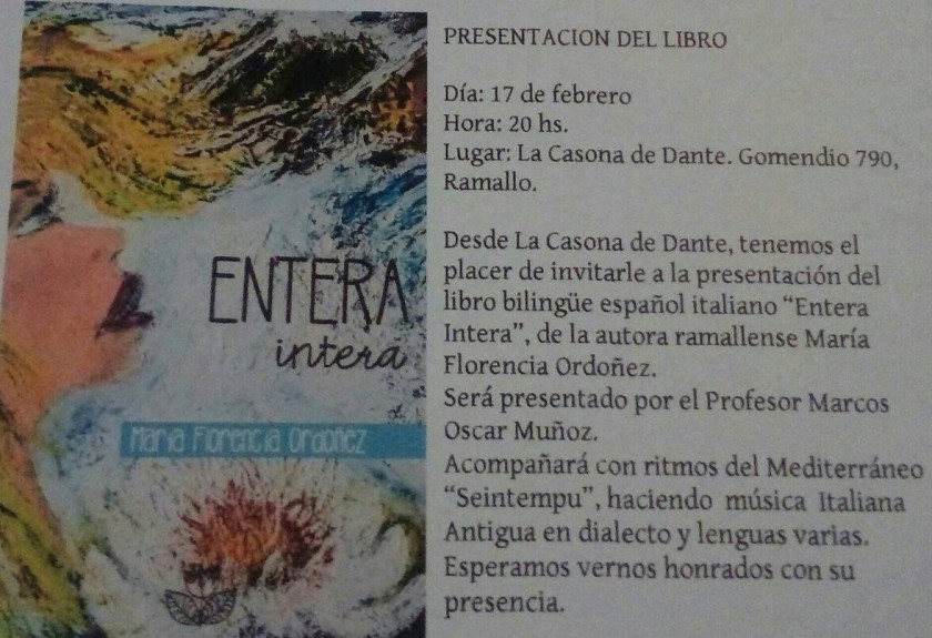 Este viernes desde las 20 horas en "La Casona de Dante" Gomendio 790 de la ciudad de Ramallo la poeta ramallense presenta su trabajo poético bilingüe, español e italiano.