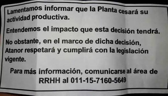 Atanor cerró sus puertas, 60 familias baraderenses quedan en la calle.