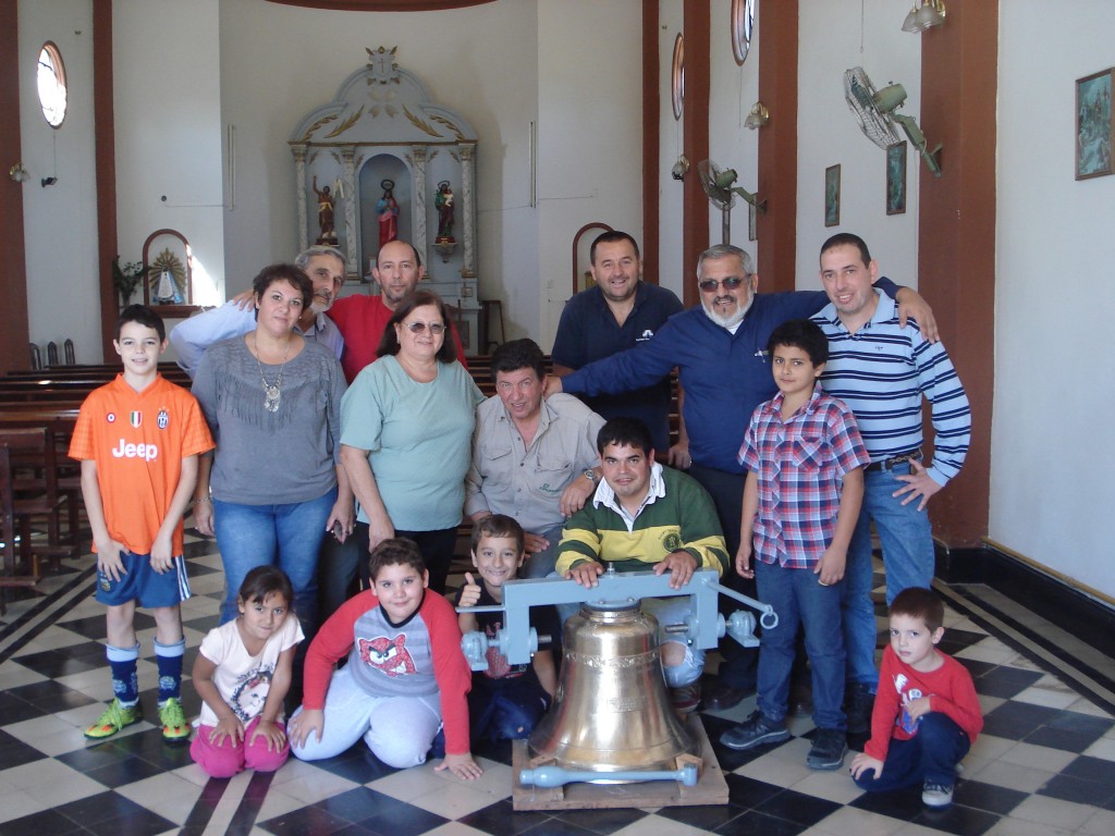 El padre Luis Muñoz junto al grupo que trabaja incansablemente se mostraron muy felices cuando pasada la una de la tarde de este viernes recibieron la campana que costó 99 mil pesos en Villa Ramallo desde la ciudad santafesina de Rafaela.
