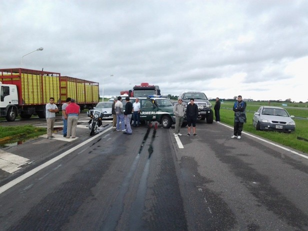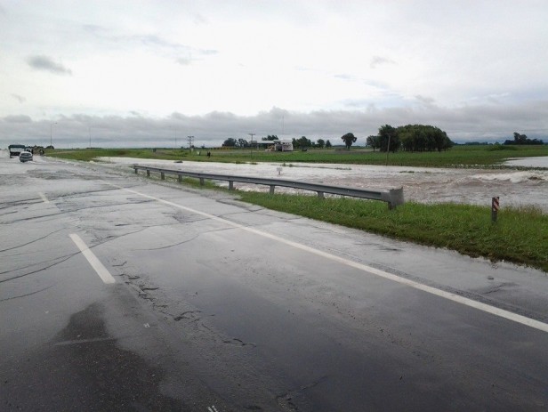 La ruta nacional 9 a la altura del kilómetro 210, arroyo Marcone, permanece cortada como consecuencia del agua acumulada que viene bajando por los campos e impide la normal circulación de los vehículos.