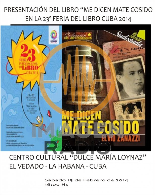 El próximo sábado 15 de Febrero, a las 16 Hs. estaré presentando en Cuba el libro ME DICEN MATE COSIDO, editado por iniciativa y tozudez de Revista y Editorial Sudestada. Teníamos un viaje previsto desde el día 13 con la Negra, mi mujer y por gestiones encomiables llevadas adelante por el ex Diputado Provincial y actual Concejal de Ramallo, Ricardo Gorostiza podemos cumplir este sueño de participar en un acontecimiento de alto nivel internacional como es la 23º Feria del Libro Cuba 2014. Asimismo, y por gestiones similares de Gorostiza, la Embajada Argentina en La Habana se interesó en nuestra presencia artística allí y nos acompañará en carácter oficial por decisión de la Embajadora de nuestro país en Cuba, Juliana Marino.