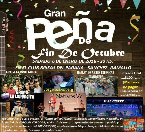 Se viene la Gran Peña en la localidad de Villa General Savio para recaudar fondos, con el objetivo de poder pagar los gastos del viaje del grupo "Fin de Octubre" que en los próximos días se estará presentado en el festival de Cosquín.