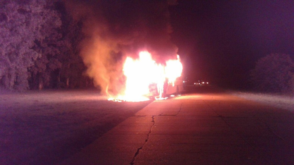 Se desplazaron dos dotaciones de bomberos, autobomba y un camión cisterna. El hecho se produjo en el camino de la costa a la altura del frigorífico Mark y las 20 personas que viajaban en el rodado descendieron sin sufrir lesiones.