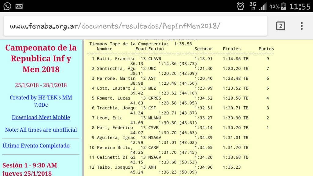 Se está desarrollando en Cipolletti, Río Negro, el Campeonato Nacional de Natación para nadadores Infantiles y Menores. En la primera jornada, Francisco Butti (Los Andes) fue 1° en 100 metros pecho consagrándose campeón Nacional. Están participando también, Dolores Malacalza y Clementina Butti (Los Andes), Bianca Lamberti (Defensores) y Agustín Degliantoni (Náutico).