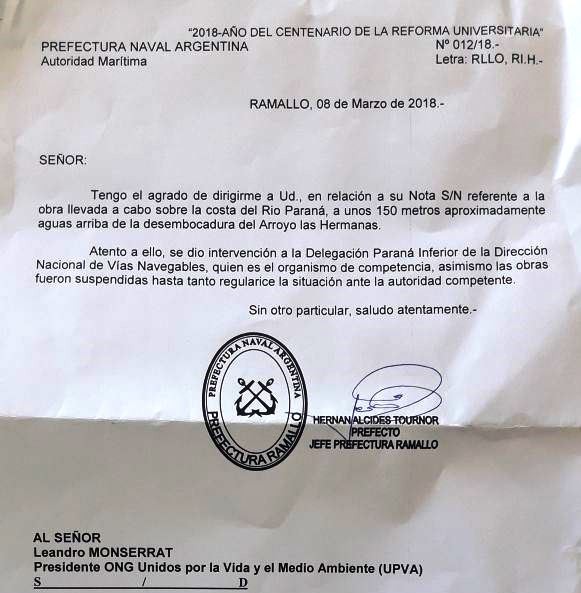 Desde la ONG UPVA hacemos conocer a la comunidad de Ramallo que hemos recibido un comunicado de Prefectura Naval Argentina con fecha 08 de Marzo, dando respuesta a una denuncia realizada con anterioridad por la construcción ilegal de un espigón y un terraplén en la boca del arroyo Las Hermanas en Ramallo. En la misma se detalla la orden de suspender las mencionadas obras, emitida por la Delegación Paraná Inferior de la Dirección Nacional de Vías Navegables.