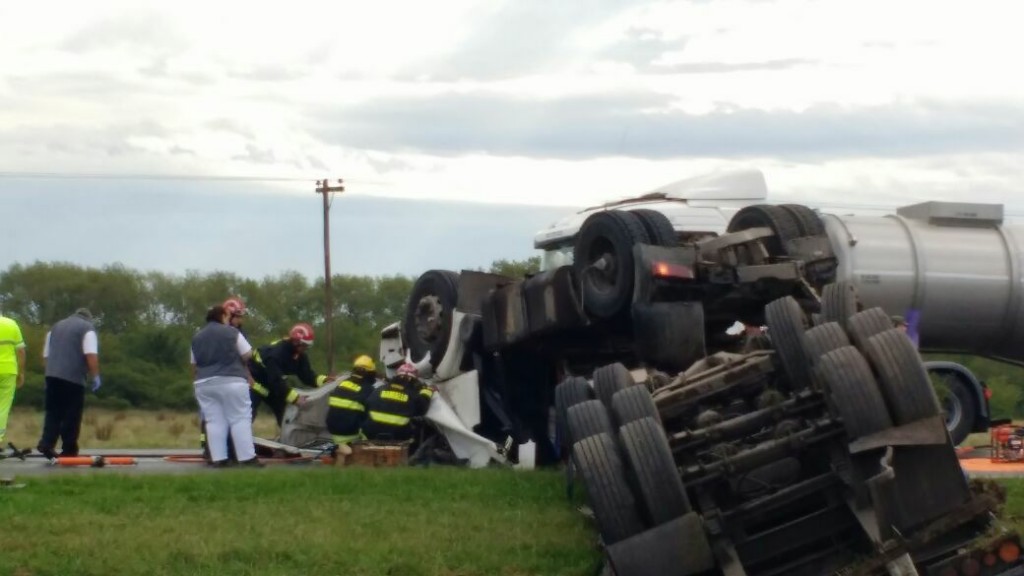 Al lugar concurrió una dotación de bomberos que trabajó en el lugar para liberar a un chofer de camion qué quedo atrapado luego de volcar sobre el carril Rosario- Buenos Aires.
