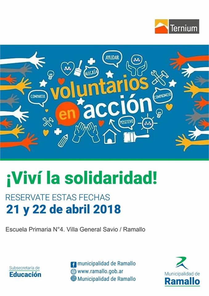 En el marco del programa de Voluntariado Corporativo de Ternium Siderar y sumando el aporte económico de la Fundación Hermanos Agustín y Roberto Rocca el próximo sábado 21 y domingo 22 de abril, tendrán lugar las jornadas “Voluntarios en Acción” en la Escuela Primaria N°4 “José de San Martín” de la localidad de Villa General Savio.