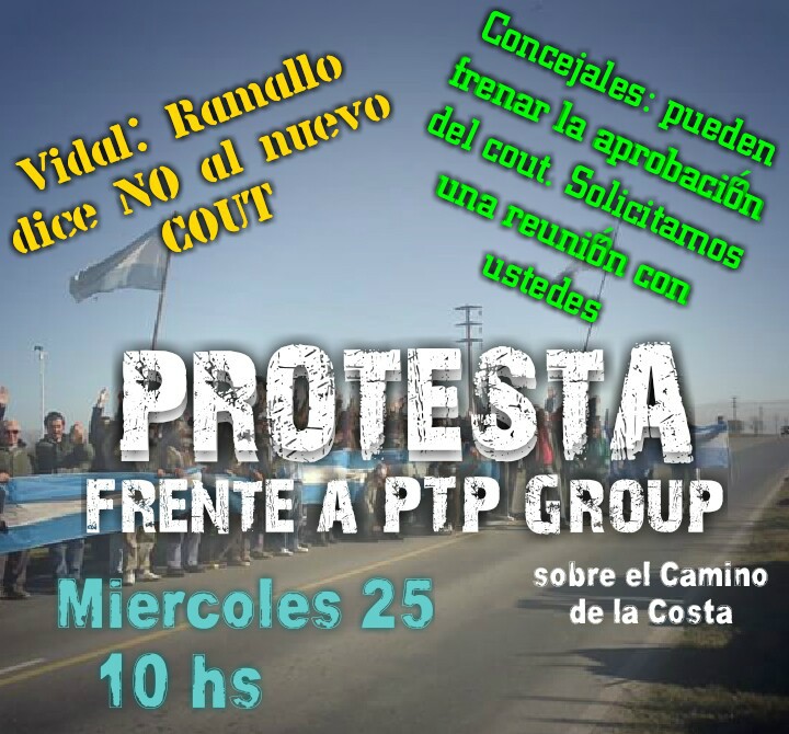 Este miércoles de 10 a 14 hs, frente a PTP Group que se encuentra sobre el camino de la Costa, jornada de Protesta convocada por Vecinos Auto convocados, Asamblea Vecinal Ramallo y UPVA para expresar el rechazo al nuevo COUT.