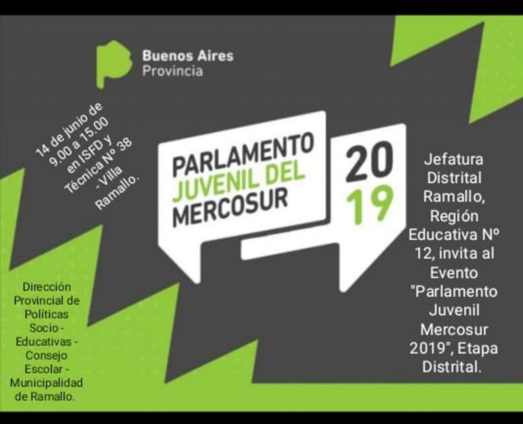 Este viernes 14 de 9,30 a 15 horas se realizará la edición “VIII Parlamento Juvenil Mercosur 2019” - Instancia Distrital en el Instituto Superior de Formación Técnica Nro. 38.