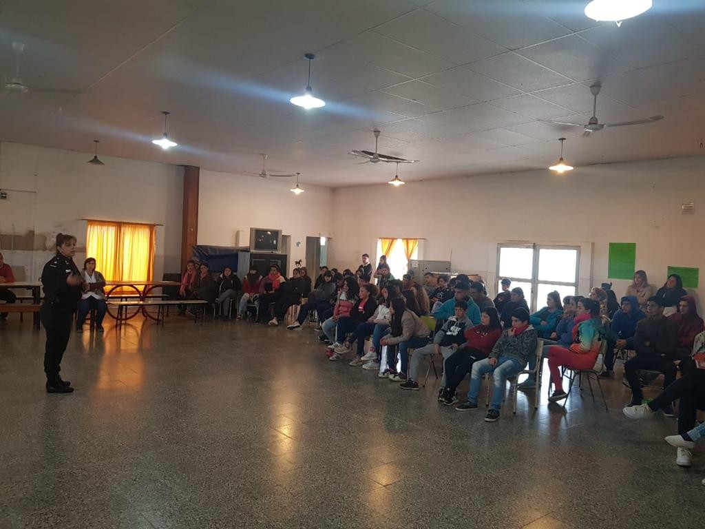 La titular de la Comisaría de la Mujer y la Familia Ramallo junto a la Asistente Social del Equipo Interdisciplinario de la Dependencia, Secretaría de Seguridad de la Municipalidad de Ramallo y Centro de Monitoreo, desarrollaron una charla informativa en la Escuela de Educación Secundaria Nro. 7 de la localidad de El Paraíso.