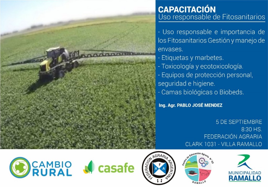 La Municipalidad, el Centro de Educación Agraria de Ramallo (CEA 32), UPCN y el INTA dictarán este jueves 5 de septiembre una capacitación sobre “Las Buenas Prácticas Agrícolas y el uso razonable de los Fitosanitarios”.