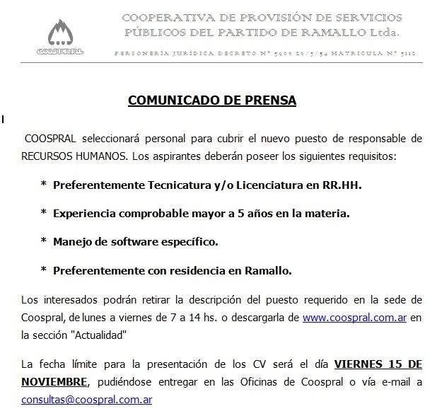 Coospral seleccionará personal para cubrir el puesto de responsable en Recursos Humanos.