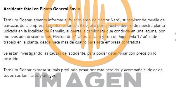 Ternium Siderar lamenta informar el fallecimiento de Héctor Nardi, supervisor de muelle de barcazas de la empresa Loginter, el lunes 28 de julio por la noche dentro de nuestra planta ubicada en la localidad de Ramallo, al caerse la camioneta que conducía en una laguna, por motivos aún desconocidos. Héctor, de 51 años, casado y con un hijo, tenía 17 años de trabajo en la planta, desde hace más de cuatro para esta empresa contratista.
