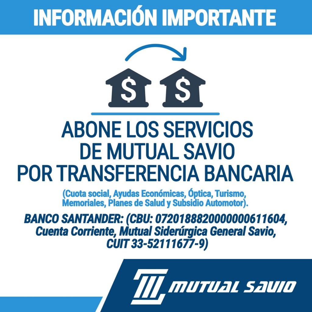 Los asociados podrán abonar las deudas correspondientes a servicios de la entidad (cuota social, ayudas económicas, óptica, turismo, memoriales y planes de salud, subsidio automotor y CCV), mediante transferencias bancarias a la cuenta de la entidad (CBU: 0720188820000000611604, SANTANDER, Cuenta Corriente, Mutual Siderúrgica General Savio, CUIT 33-52111677-9). Deberá notificarse el pago efectuado, enviando un mail: [email protected] o al mensaje de Whatsapp al número: 3364521896, indicando: datos personales de quien efectuó la transferencia, cuál/es son los servicios que se pretenden pagar y a nombre de quién, y adjuntando una copia o foto del comprobante de la transacción.